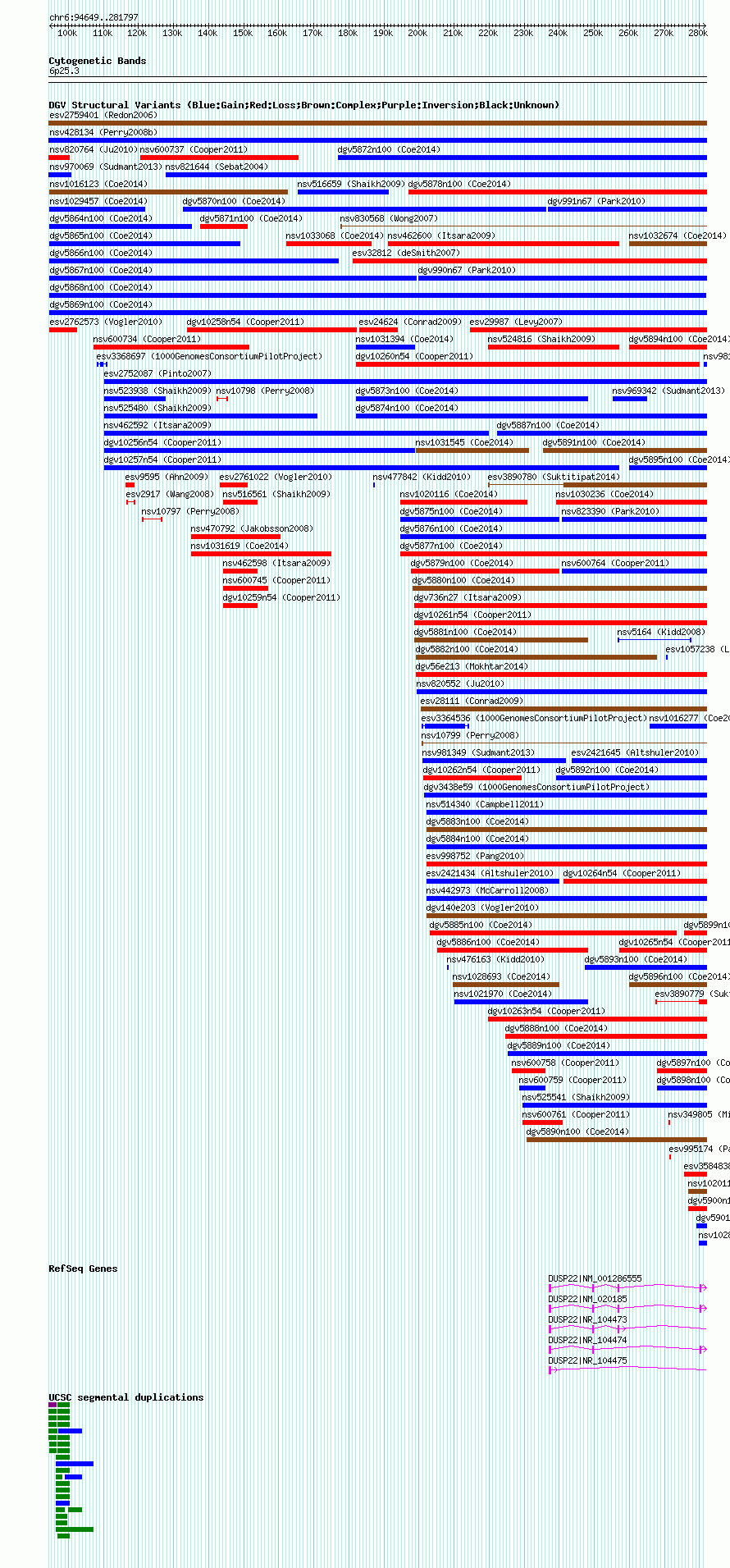 | Variant Type | CNV gain | Copy Number | | Allele State | | Allele Origin | | Probe Count | | Validation Flag | | Merged Status | M | Merged Variants | | Supporting Variants | nsv1015256, nsv1032314 | Samples | | Known Genes | DUSP22 | Method | SNP array | Analysis | Affymetrix SNP array copy number analysis | Platform | Affymetrix SNP Array 6.0 | Comments | | Reference | Coe_et_al_2014 | Pubmed ID | 25217958 | Accession Number(s) | dgv5868n100