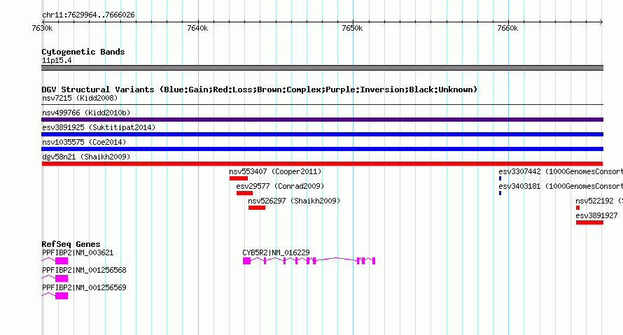 Variant DetailsVariant: dgv58n21| Internal ID | 20131779 | | Landmark | | | Location Information | | | Cytoband | 11p15.4 | | Allele length | | Assembly | Allele length | | hg38 | 36063 | | hg19 | 36063 | | hg18 | 36063 | | hg17 | 36063 |