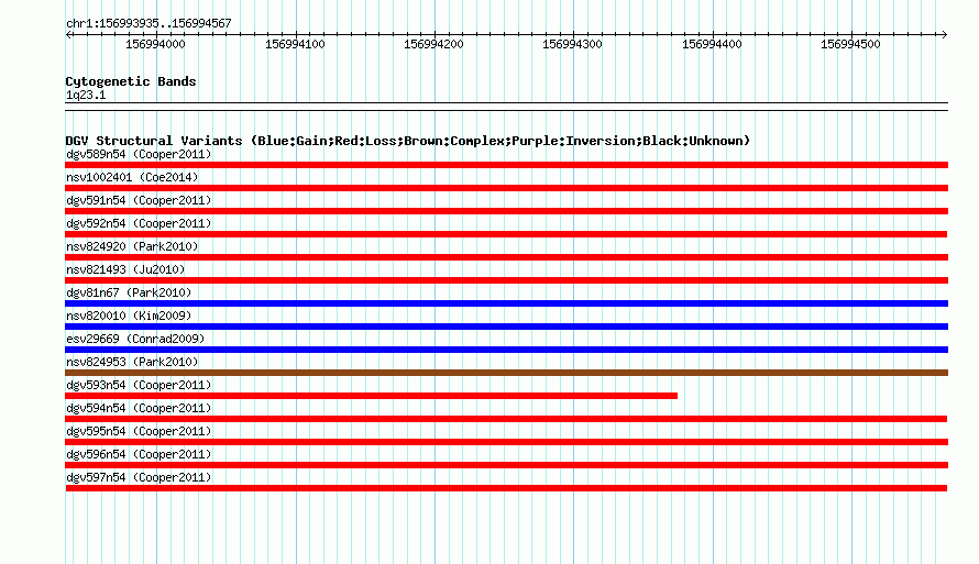 Variant DetailsVariant: dgv597n54| Internal ID | 22768492 | | Landmark | | | Location Information | | | Cytoband | 1q23.1 | | Allele length | | Assembly | Allele length | | hg38 | 633 | | hg19 | 633 | | hg18 | 633 |