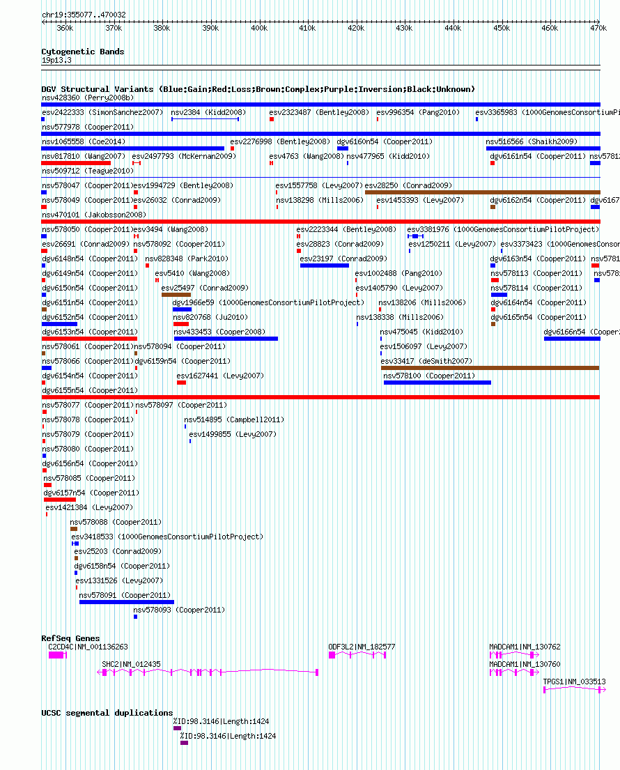 | Variant Type | CNV loss | Copy Number | | Allele State | | Allele Origin | | Probe Count | | Validation Flag | | Merged Status | M | Merged Variants | | Supporting Variants | nsv578069, nsv578068 | Samples | | Known Genes | C2CD4C, MADCAM1, ODF3L2, SHC2, TPGS1 | Method | SNP array | Analysis | Illumina SNP array copy number analysis | Platform | Not reported | Comments | | Reference | Cooper_et_al_2011 | Pubmed ID | 21841781 | Accession Number(s) | dgv6155n54