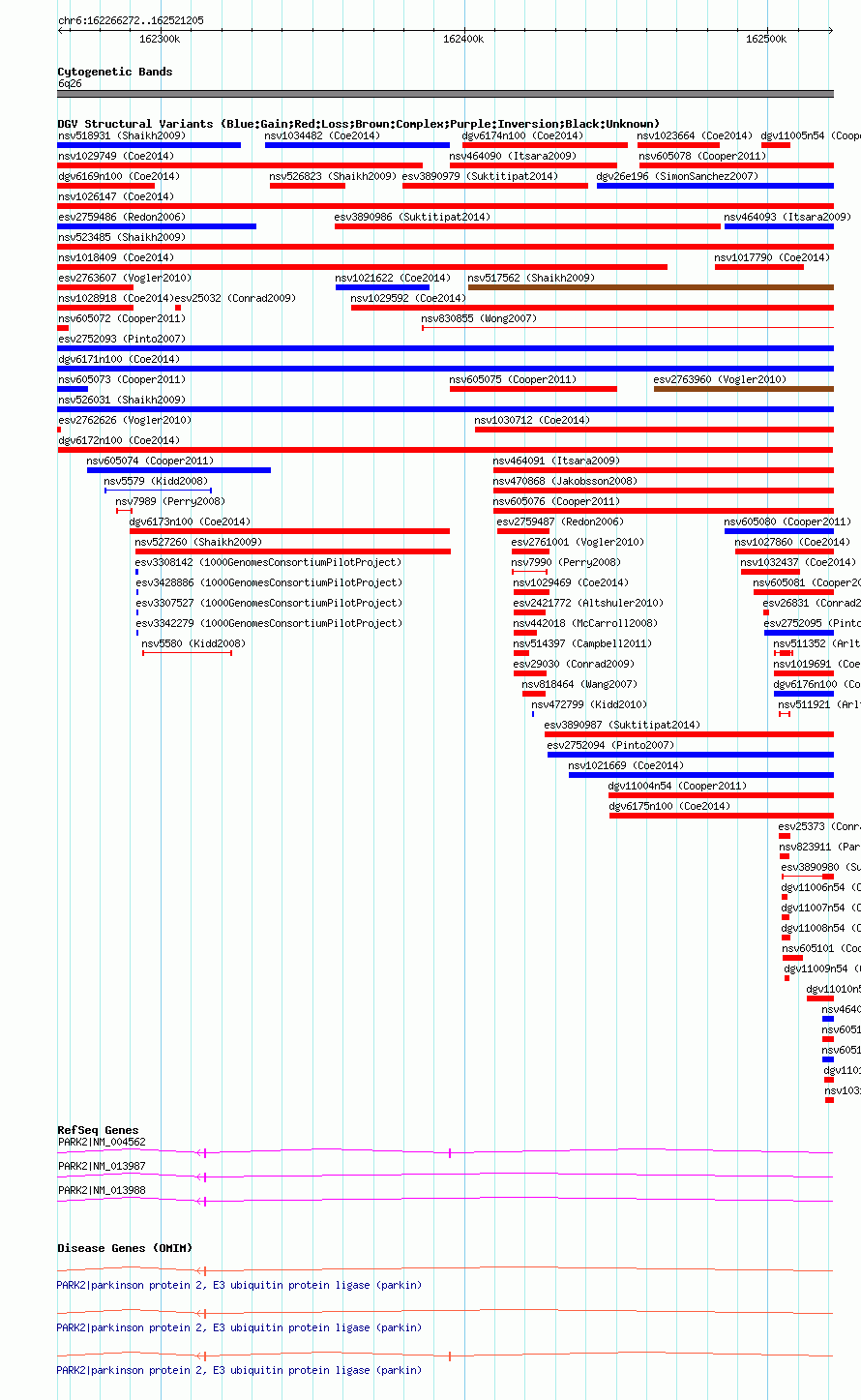 | | Variant Type | CNV loss | | Copy Number | | | Allele State | | | Allele Origin | | | Probe Count | | | Validation Flag | | | Merged Status | M | | Merged Variants | | | Supporting Variants | nsv1020928, nsv1022804 | | Samples | | | Known Genes | PARK2 | | Method | SNP array | | Analysis | Affymetrix SNP array copy number analysis | | Platform | Affymetrix SNP Array 6.0 | | Comments | | | Reference | Coe_et_al_2014 | | Pubmed ID | 25217958 | | Accession Number(s) | dgv6172n100