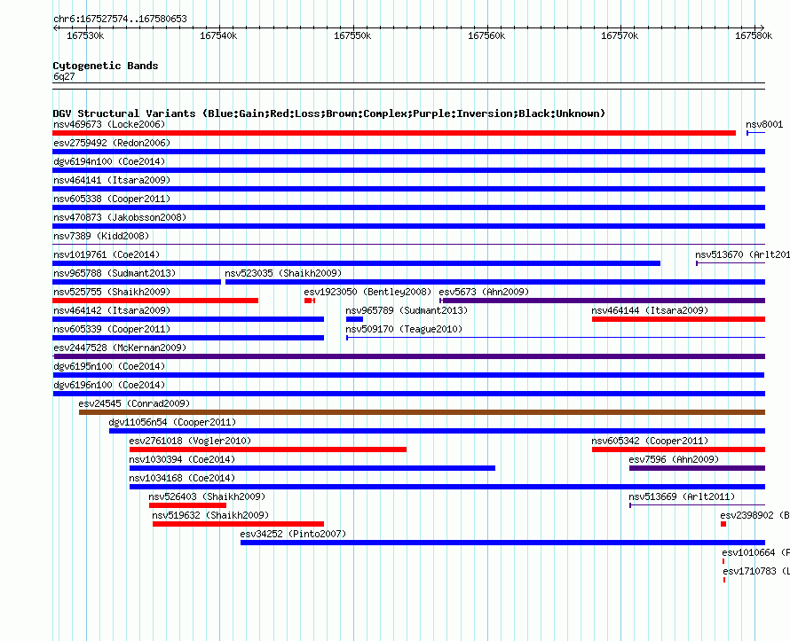 Variant DetailsVariant: dgv6195n100| Internal ID | 22792282 | | Landmark | | | Location Information | | | Cytoband | 6q27 | | Allele length | | Assembly | Allele length | | hg38 | 53080 | | hg19 | 53080 | | hg18 | 53080 |