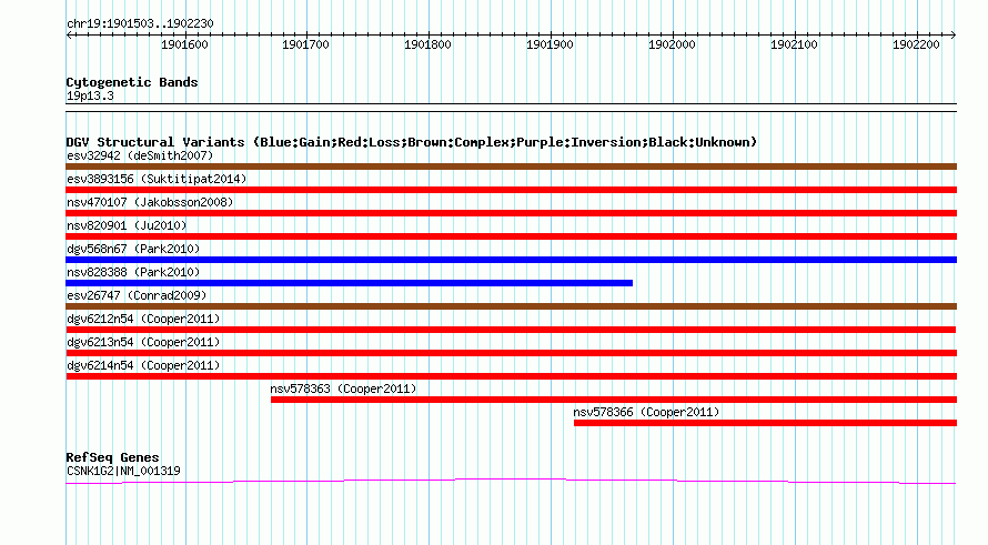 | | Variant Type | CNV loss | | Copy Number | | | Allele State | | | Allele Origin | | | Probe Count | | | Validation Flag | | | Merged Status | M | | Merged Variants | | | Supporting Variants | nsv578348, nsv578356, nsv578350, nsv578358, nsv578349, nsv578359 | | Samples | | | Known Genes | CSNK1G2 | | Method | SNP array | | Analysis | Illumina SNP array copy number analysis | | Platform | Not reported | | Comments | | | Reference | Cooper_et_al_2011 | | Pubmed ID | 21841781 | | Accession Number(s) | dgv6212n54