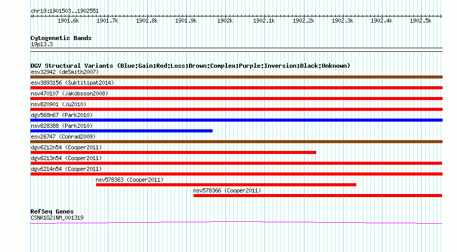 | | Variant Type | CNV loss | | Copy Number | | | Allele State | | | Allele Origin | | | Probe Count | | | Validation Flag | | | Merged Status | M | | Merged Variants | | | Supporting Variants | nsv578352, nsv578364, nsv578360, nsv578354, nsv578361, nsv578357, nsv578353, nsv578362, nsv578351 | | Samples | | | Known Genes | CSNK1G2 | | Method | SNP array | | Analysis | Illumina SNP array copy number analysis | | Platform | Not reported | | Comments | | | Reference | Cooper_et_al_2011 | | Pubmed ID | 21841781 | | Accession Number(s) | dgv6213n54
