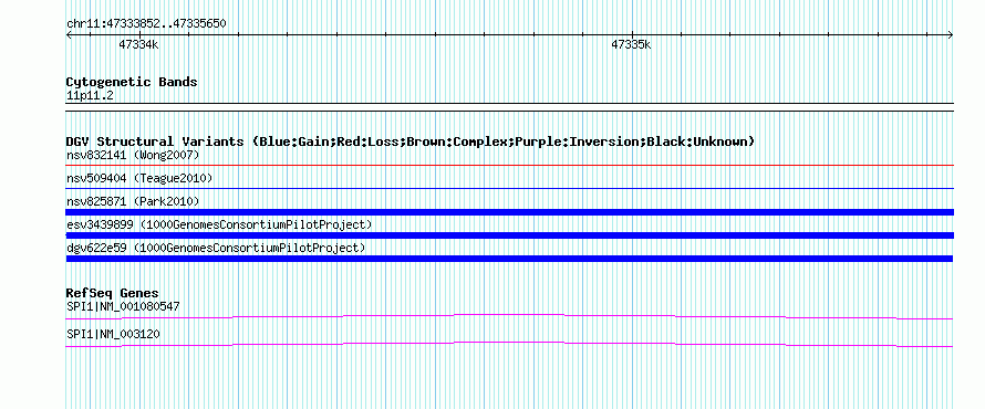 | | Variant Type | CNV duplication | | Copy Number | | | Allele State | | | Allele Origin | | | Probe Count | | | Validation Flag | | | Merged Status | M | | Merged Variants | | | Supporting Variants | esv3380389, esv3337151 | | Samples | NA19238, NA19239 | | Known Genes | SPI1 | | Method | Sequencing | | Analysis | | | Platform | Illumina | | Comments | | | Reference | 1000_Genomes_Consortium_Pilot_Project | | Pubmed ID | 20981092 | | Accession Number(s) | dgv622e59