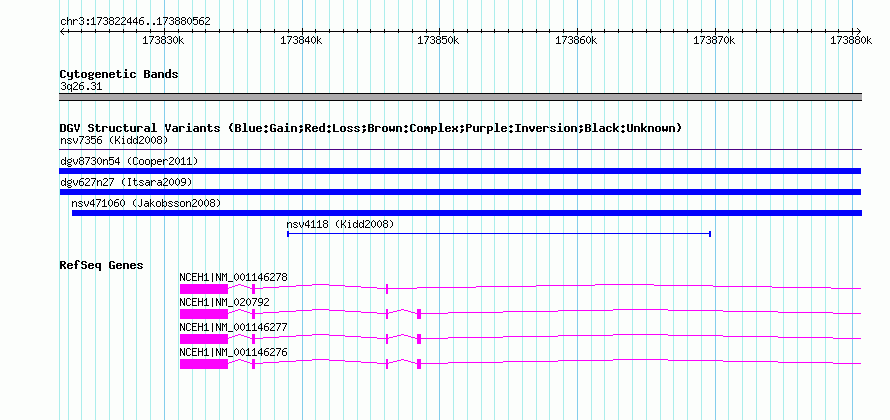 Variant DetailsVariant: dgv627n27| Internal ID | 22767356 | | Landmark | | | Location Information | | | Cytoband | 3q26.31 | | Allele length | | Assembly | Allele length | | hg38 | 58117 | | hg19 | 58117 | | hg18 | 58117 | | hg17 | 58117 |
