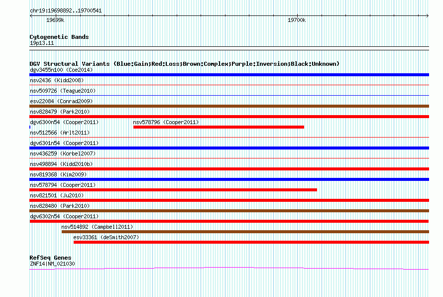 Variant DetailsVariant: dgv6302n54| Internal ID | 22774197 | | Landmark | | | Location Information | | | Cytoband | 19p13.11 | | Allele length | | Assembly | Allele length | | hg38 | 1650 | | hg19 | 1650 | | hg18 | 1650 |