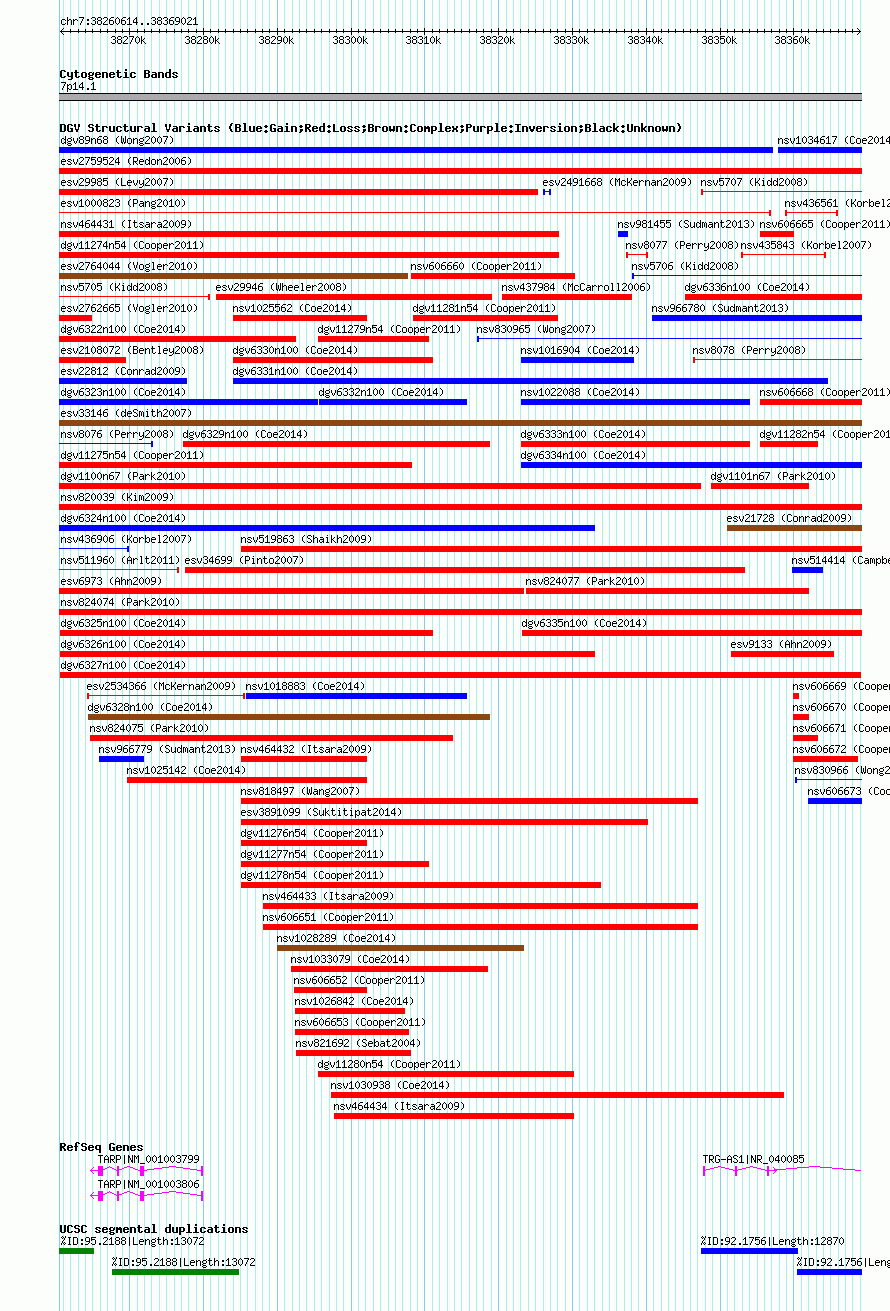 Variant DetailsVariant: dgv6327n100| Internal ID | 20157943 | | Landmark | | | Location Information | | | Cytoband | 7p14.1 | | Allele length | | Assembly | Allele length | | hg38 | 108408 | | hg19 | 108408 | | hg18 | 108408 |