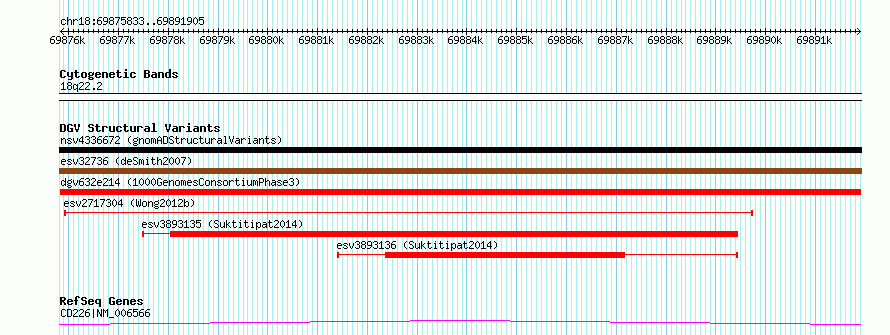 | | Variant Type | CNV loss | | Copy Number | | | Allele State | | | Allele Origin | | | Probe Count | | | Validation Flag | | | Merged Status | M | | Merged Variants | | | Supporting Variants | esv3642978, esv3642979 | | Samples | NA06984, HG03947, HG03061 | | Known Genes | CD226 | | Method | Sequencing | | Analysis | | | Platform | Multiple platforms | | Comments | | | Reference | 1000_Genomes_Consortium_Phase_3 | | Pubmed ID | 21293372 | | Accession Number(s) | dgv632e214