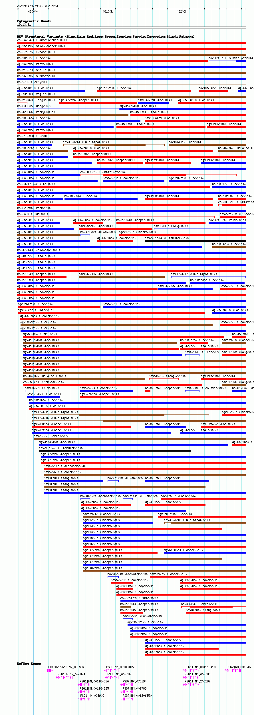 Variant DetailsVariant: dgv6465n54| Internal ID | 22774360 | | Landmark | | | Location Information | | | Cytoband | 19q13.2 | | Allele length | | Assembly | Allele length | | hg38 | 307295 | | hg19 | 307295 | | hg18 | 307295 |