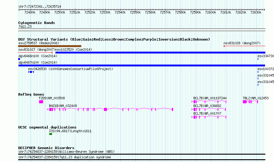 | Variant Type | CNV gain | Copy Number | | Allele State | | Allele Origin | | Probe Count | | Validation Flag | | Merged Status | M | Merged Variants | | Supporting Variants | nsv1028905, nsv1023128 | Samples | | Known Genes | BAZ1B, BCL7B, FZD9, TBL2 | Method | SNP array | Analysis | Affymetrix SNP array copy number analysis | Platform | Affymetrix SNP Array 6.0 | Comments | | Reference | Coe_et_al_2014 | Pubmed ID | 25217958 | Accession Number(s) | dgv6467n100