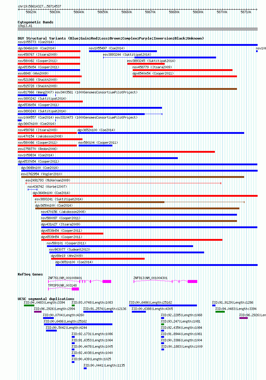 Variant DetailsVariant: dgv6537n54Internal ID | 20139961 | Landmark | | Location Information | | Cytoband | 19q13.41 | Allele length | Assembly | Allele length | hg38 | 100210 | hg19 | 100211 | hg18 | 100211 |