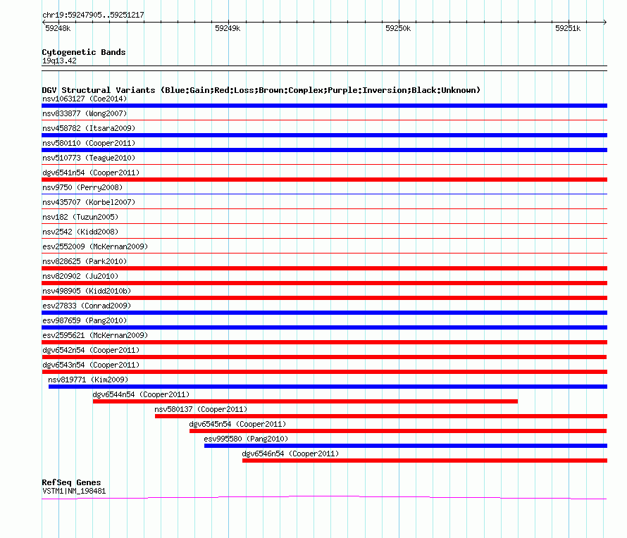 | Variant Type | CNV loss | Copy Number | | Allele State | | Allele Origin | | Probe Count | | Validation Flag | | Merged Status | M | Merged Variants | | Supporting Variants | nsv580119, nsv580129, nsv580123, nsv580116, nsv580118, nsv580124, nsv580117 | Samples | | Known Genes | VSTM1 | Method | SNP array | Analysis | Illumina SNP array copy number analysis | Platform | Not reported | Comments | | Reference | Cooper_et_al_2011 | Pubmed ID | 21841781 | Accession Number(s) | dgv6542n54