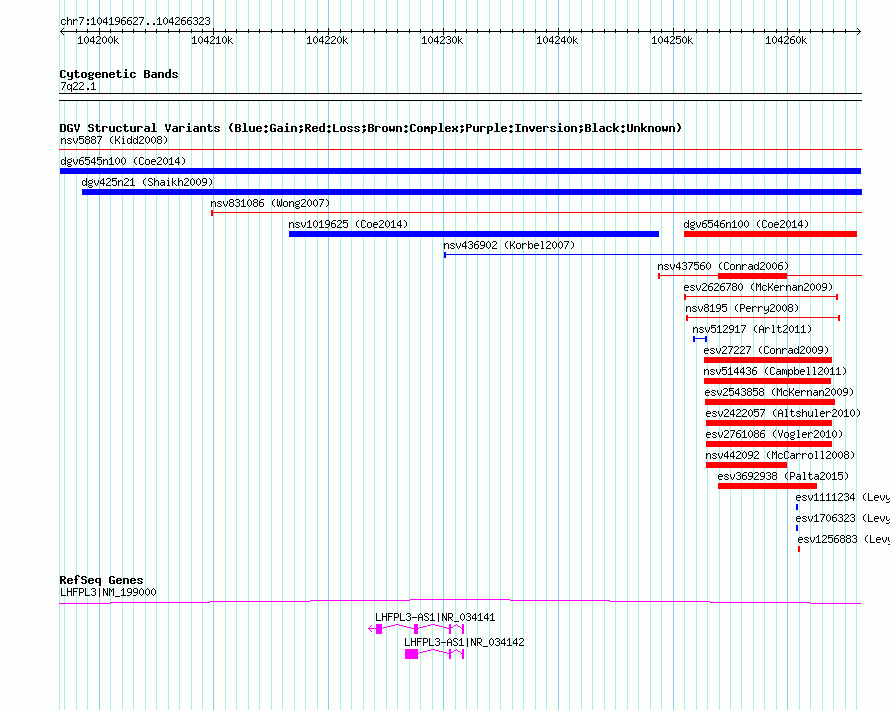 | | Variant Type | CNV gain | | Copy Number | | | Allele State | | | Allele Origin | | | Probe Count | | | Validation Flag | | | Merged Status | M | | Merged Variants | | | Supporting Variants | nsv1028479, nsv1030875 | | Samples | | | Known Genes | LHFPL3, LHFPL3-AS1 | | Method | SNP array | | Analysis | Affymetrix SNP array copy number analysis | | Platform | Affymetrix SNP Array 6.0 | | Comments | | | Reference | Coe_et_al_2014 | | Pubmed ID | 25217958 | | Accession Number(s) | dgv6545n100