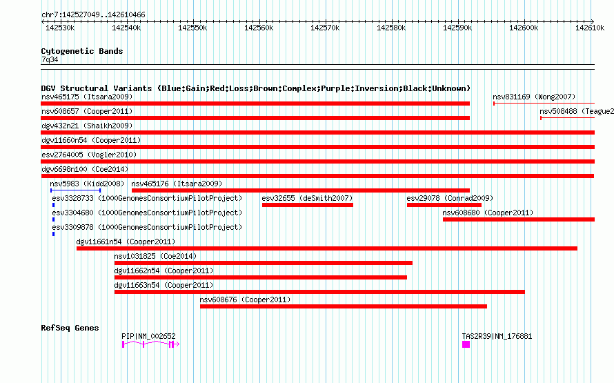 | | Variant Type | CNV loss | | Copy Number | | | Allele State | | | Allele Origin | | | Probe Count | | | Validation Flag | | | Merged Status | M | | Merged Variants | | | Supporting Variants | nsv1034112, nsv1023470, nsv1016130, nsv1026139, nsv1019153, nsv1016175, nsv1018996, nsv1023242, nsv1022193, nsv1031431, nsv1020588, nsv1027804, nsv1020889, nsv1031198 | | Samples | | | Known Genes | PIP, TAS2R39 | | Method | SNP array | | Analysis | Affymetrix SNP array copy number analysis | | Platform | Affymetrix SNP Array 6.0 | | Comments | | | Reference | Coe_et_al_2014 | | Pubmed ID | 25217958 | | Accession Number(s) | dgv6698n100