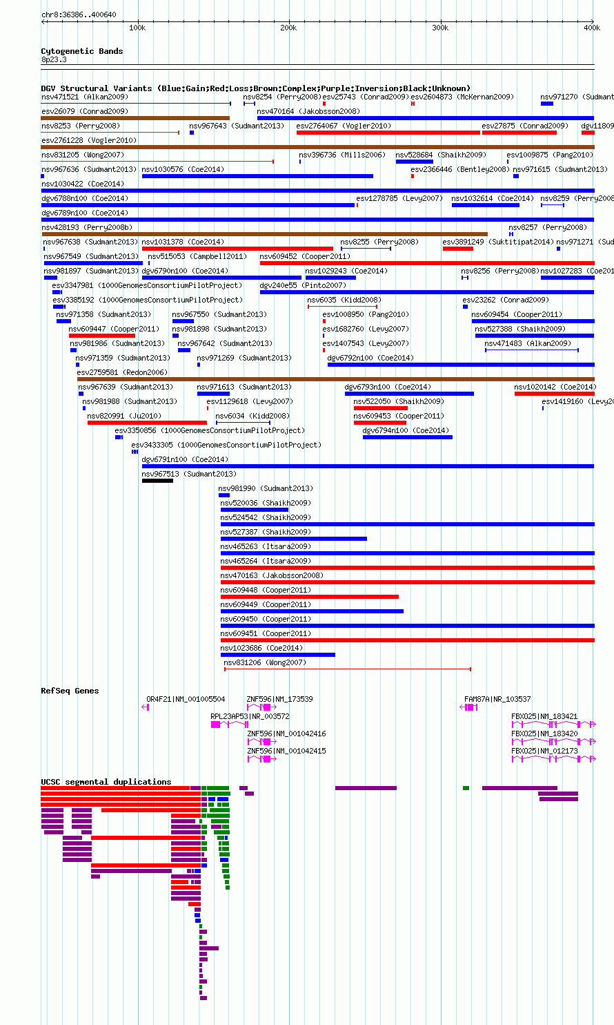 | Variant Type | CNV gain | Copy Number | | Allele State | | Allele Origin | | Probe Count | | Validation Flag | | Merged Status | M | Merged Variants | | Supporting Variants | nsv1021238, nsv1034957, nsv1029069, nsv1032564, nsv1018817 | Samples | | Known Genes | FAM87A, FBXO25, OR4F21, RPL23AP53, ZNF596 | Method | SNP array | Analysis | Affymetrix SNP array copy number analysis | Platform | Affymetrix SNP Array 6.0 | Comments | | Reference | Coe_et_al_2014 | Pubmed ID | 25217958 | Accession Number(s) | dgv6789n100
