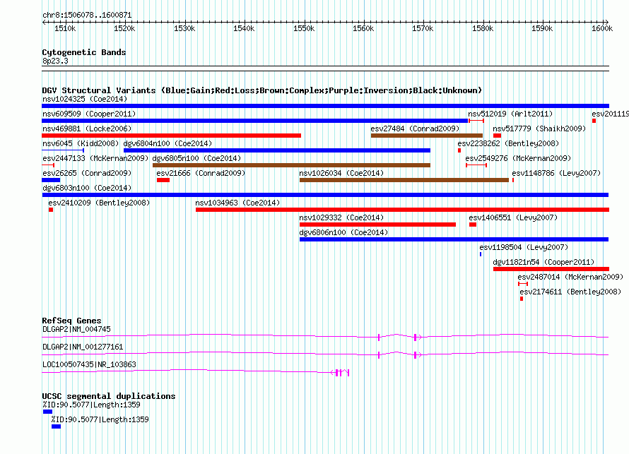 | Variant Type | CNV gain | Copy Number | | Allele State | | Allele Origin | | Probe Count | | Validation Flag | | Merged Status | M | Merged Variants | | Supporting Variants | nsv1018421, nsv1031784, nsv1027685 | Samples | | Known Genes | DLGAP2, LOC100507435 | Method | SNP array | Analysis | Affymetrix SNP array copy number analysis | Platform | Affymetrix SNP Array 6.0 | Comments | | Reference | Coe_et_al_2014 | Pubmed ID | 25217958 | Accession Number(s) | dgv6803n100