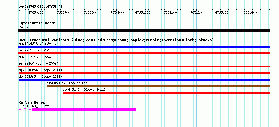 | | Variant Type | CNV loss | | Copy Number | | | Allele State | | | Allele Origin | | | Probe Count | | | Validation Flag | | | Merged Status | M | | Merged Variants | | | Supporting Variants | nsv581761, nsv581757 | | Samples | | | Known Genes | KCNK12 | | Method | SNP array | | Analysis | Illumina SNP array copy number analysis | | Platform | Not reported | | Comments | | | Reference | Cooper_et_al_2011 | | Pubmed ID | 21841781 | | Accession Number(s) | dgv6848n54