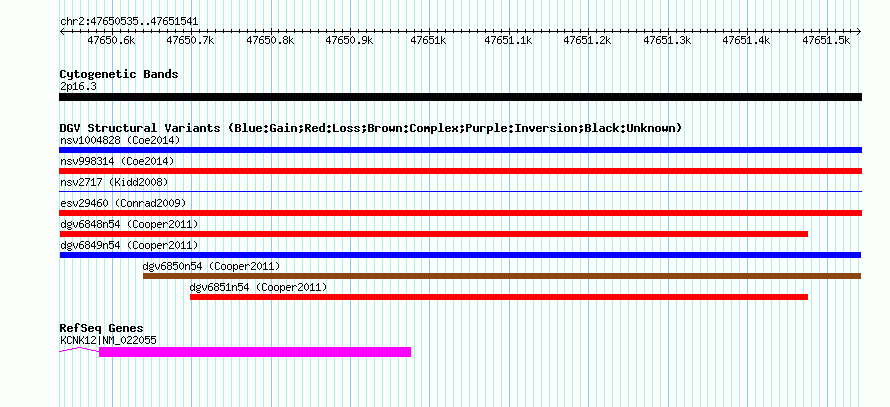 | | Variant Type | CNV gain | | Copy Number | | | Allele State | | | Allele Origin | | | Probe Count | | | Validation Flag | | | Merged Status | M | | Merged Variants | | | Supporting Variants | nsv581759, nsv581767, nsv581768, nsv581769, nsv581766, nsv581758, nsv581763 | | Samples | | | Known Genes | KCNK12 | | Method | SNP array | | Analysis | Illumina SNP array copy number analysis | | Platform | Not reported | | Comments | | | Reference | Cooper_et_al_2011 | | Pubmed ID | 21841781 | | Accession Number(s) | dgv6849n54