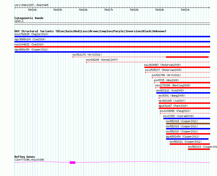 Variant DetailsVariant: dgv6891n54| Internal ID | 22774786 | | Landmark | | | Location Information | | | Cytoband | 2p16.2 | | Allele length | | Assembly | Allele length | | hg38 | 7649 | | hg19 | 7649 | | hg18 | 7649 |