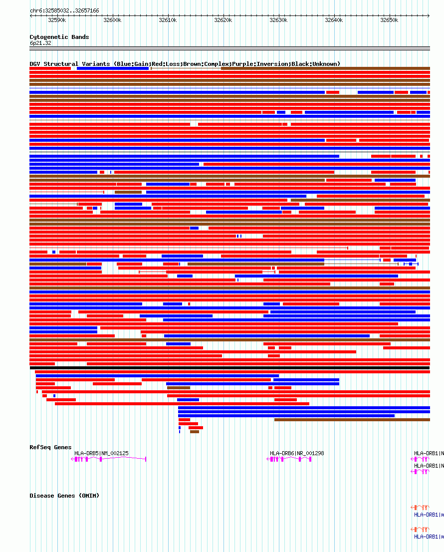 Variant DetailsVariant: dgv6e3 | Internal ID | 22760941 | | Landmark | | | Location Information | | | Cytoband | 6p21.32 | | Allele length | | Assembly | Allele length | | hg38 | 72135 | | hg19 | 72135 | | hg18 | 72135 |