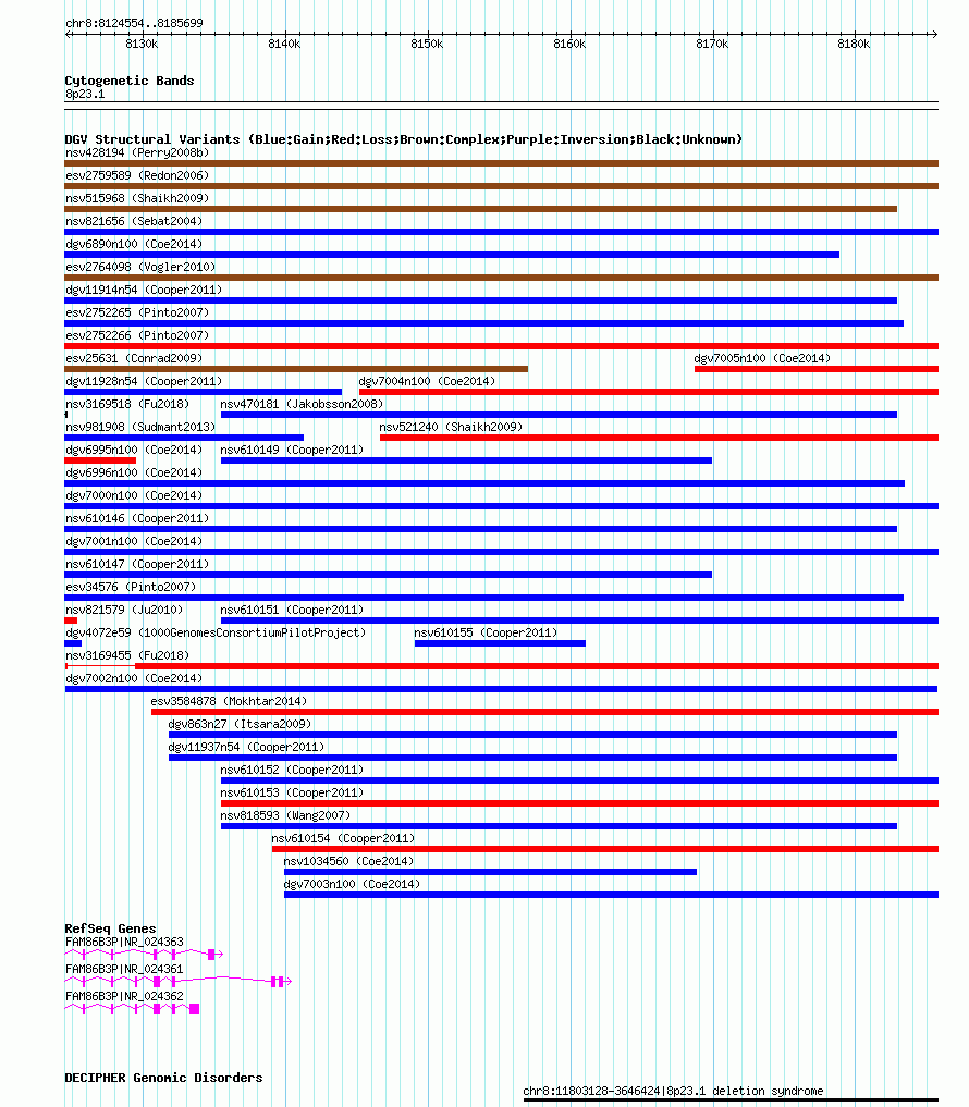 Variant DetailsVariant: dgv7002n100| Internal ID | 22793089 | | Landmark | | | Location Information | | | Cytoband | 8p23.1 | | Allele length | | Assembly | Allele length | | hg38 | 61146 | | hg19 | 61146 | | hg18 | 61146 |