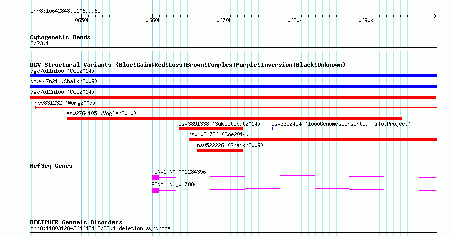 Variant DetailsVariant: dgv7012n100| Internal ID | 22793099 | | Landmark | | | Location Information | | | Cytoband | 8p23.1 | | Allele length | | Assembly | Allele length | | hg38 | 57118 | | hg19 | 57118 | | hg18 | 57118 |