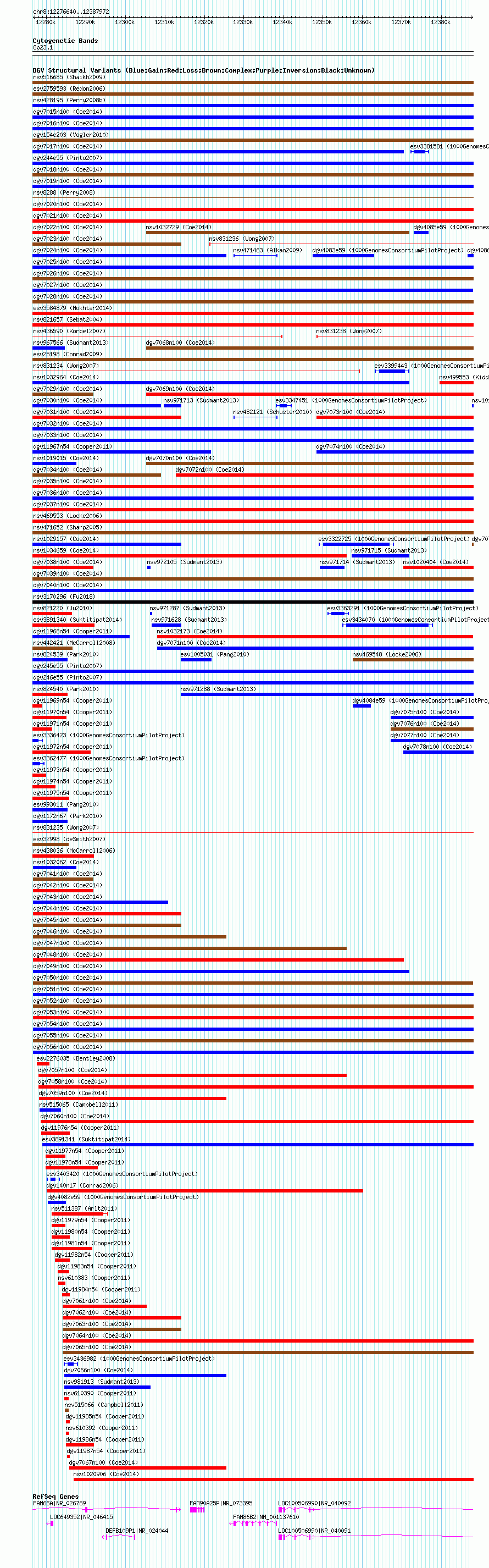 Variant DetailsVariant: dgv7050n100| Internal ID | 22793137 | | Landmark | | | Location Information | | | Cytoband | 8p23.1 | | Allele length | | Assembly | Allele length | | hg38 | 111333 | | hg19 | 111333 | | hg18 | 111333 |