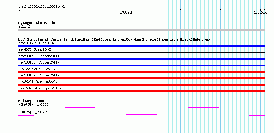| | Variant Type | CNV loss | | Copy Number | | | Allele State | | | Allele Origin | | | Probe Count | | | Validation Flag | | | Merged Status | M | | Merged Variants | | | Supporting Variants | nsv583160, nsv583161, nsv583164, nsv583163, nsv583162 | | Samples | | | Known Genes | MIR7853, NCKAP5 | | Method | SNP array | | Analysis | Illumina SNP array copy number analysis | | Platform | Not reported | | Comments | | | Reference | Cooper_et_al_2011 | | Pubmed ID | 21841781 | | Accession Number(s) | dgv7087n54