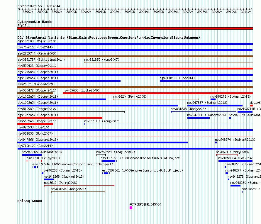 Variant DetailsVariant: dgv710n100| Internal ID | 22786797 | | Landmark | | | Location Information | | | Cytoband | 10p11.1 | | Allele length | | Assembly | Allele length | | hg38 | 161318 | | hg19 | 161318 | | hg18 | 161318 |