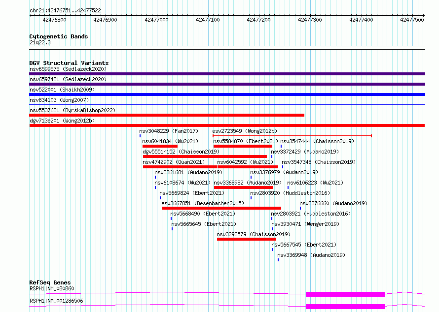 Variant DetailsVariant: dgv713e201| Internal ID | 22760071 | | Landmark | | | Location Information | | | Cytoband | 21q22.3 | | Allele length | | Assembly | Allele length | | hg38 | 772 | | hg19 | 772 |