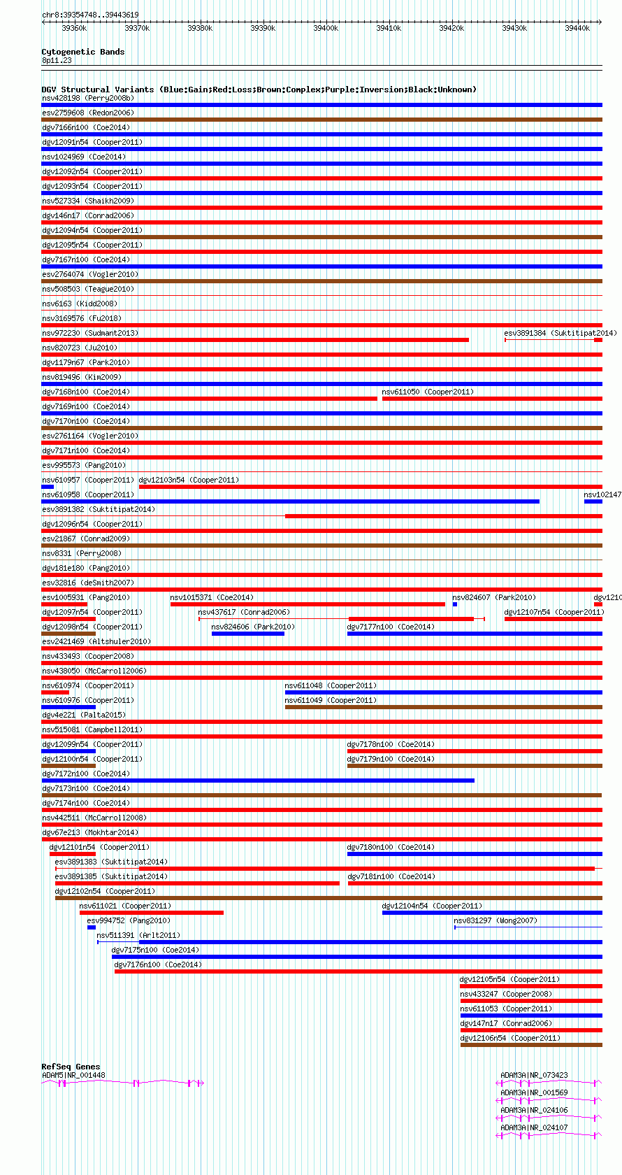 Variant DetailsVariant: dgv7173n100| Internal ID | 22793260 | | Landmark | | | Location Information | | | Cytoband | 8p11.22 | | Allele length | | Assembly | Allele length | | hg38 | 88872 | | hg19 | 88872 | | hg18 | 88872 |
