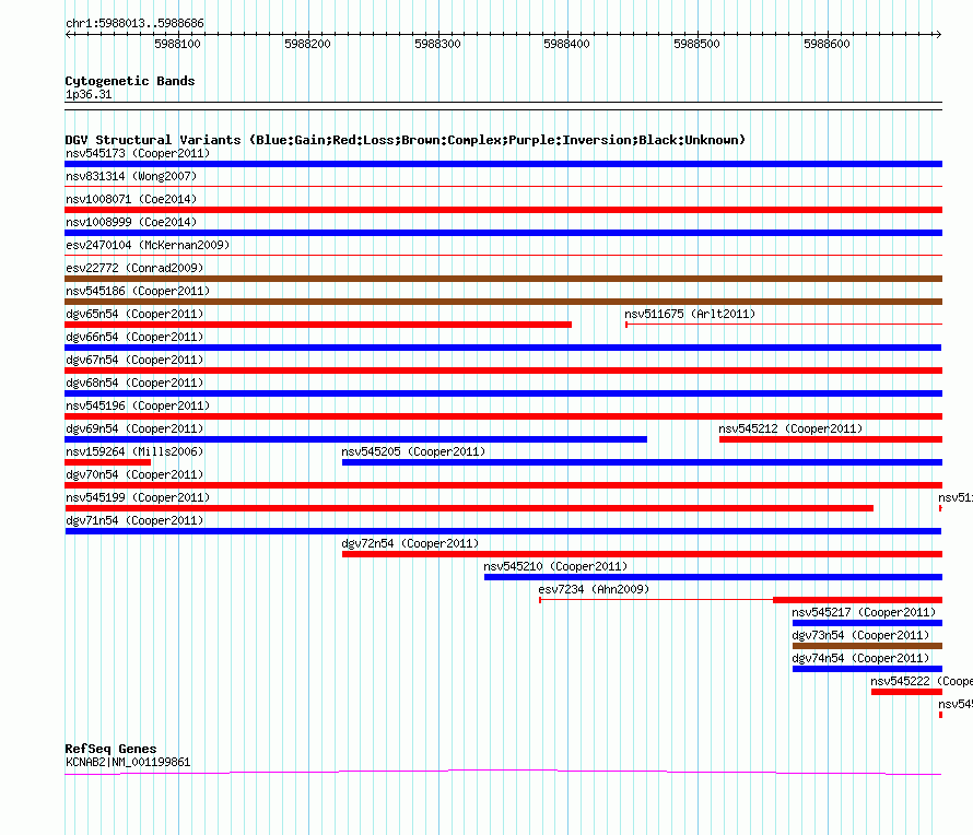Variant DetailsVariant: dgv71n54| Internal ID | 22767966 | | Landmark | | | Location Information | | | Cytoband | 1p36.31 | | Allele length | | Assembly | Allele length | | hg38 | 674 | | hg19 | 674 | | hg18 | 674 |