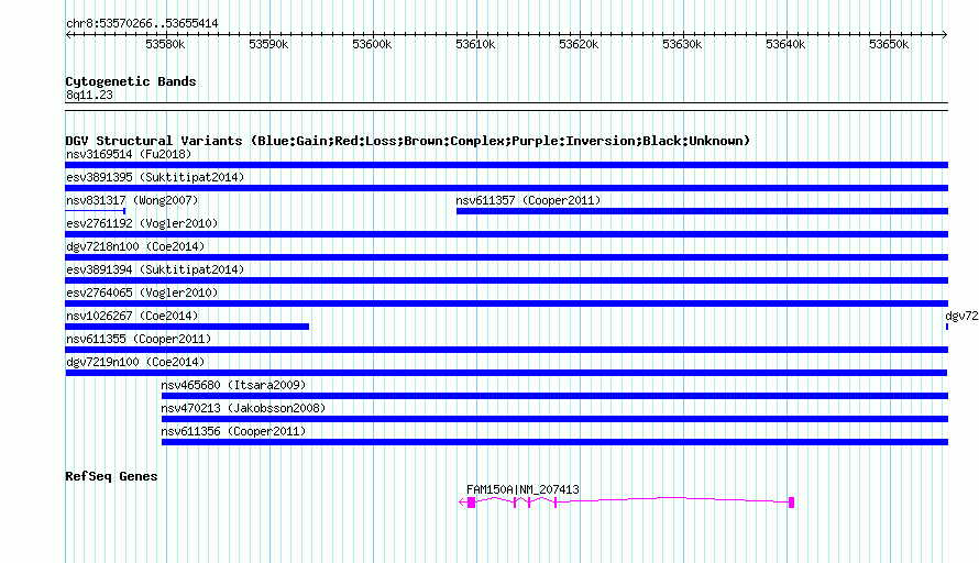 Variant DetailsVariant: dgv7219n100| Internal ID | 22793306 | | Landmark | | | Location Information | | | Cytoband | 8q11.23 | | Allele length | | Assembly | Allele length | | hg38 | 85149 | | hg19 | 85149 | | hg18 | 85149 |