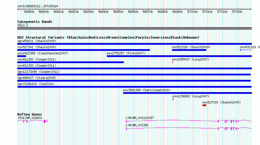 | | Variant Type | CNV gain | | Copy Number | | | Allele State | | | Allele Origin | | | Probe Count | | | Validation Flag | | | Merged Status | M | | Merged Variants | | | Supporting Variants | nsv1027297, nsv1017649, nsv1029892 | | Samples | | | Known Genes | LYN, TGS1 | | Method | SNP array | | Analysis | Affymetrix SNP array copy number analysis | | Platform | Affymetrix SNP Array 6.0 | | Comments | | | Reference | Coe_et_al_2014 | | Pubmed ID | 25217958 | | Accession Number(s) | dgv7228n100