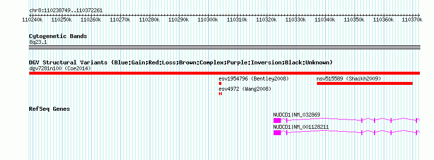 | | Variant Type | CNV loss | | Copy Number | | | Allele State | | | Allele Origin | | | Probe Count | | | Validation Flag | | | Merged Status | M | | Merged Variants | | | Supporting Variants | nsv1023204, nsv1031663 | | Samples | | | Known Genes | NUDCD1 | | Method | SNP array | | Analysis | Affymetrix SNP array copy number analysis | | Platform | Affymetrix SNP Array 6.0 | | Comments | | | Reference | Coe_et_al_2014 | | Pubmed ID | 25217958 | | Accession Number(s) | dgv7281n100