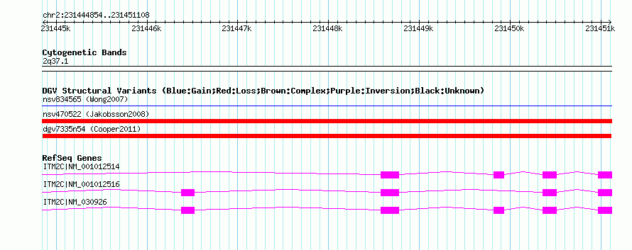 | | Variant Type | CNV loss | | Copy Number | | | Allele State | | | Allele Origin | | | Probe Count | | | Validation Flag | | | Merged Status | M | | Merged Variants | | | Supporting Variants | nsv584676, nsv584677 | | Samples | | | Known Genes | ITM2C | | Method | SNP array | | Analysis | Illumina SNP array copy number analysis | | Platform | Not reported | | Comments | | | Reference | Cooper_et_al_2011 | | Pubmed ID | 21841781 | | Accession Number(s) | dgv7335n54