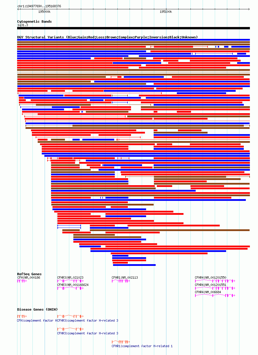 | | Variant Type | CNV loss | | Copy Number | | | Allele State | | | Allele Origin | | | Probe Count | | | Validation Flag | | | Merged Status | M | | Merged Variants | | | Supporting Variants | nsv548765, nsv548750, nsv548771 | | Samples | | | Known Genes | CFH, CFHR1, CFHR3, CFHR4 | | Method | SNP array | | Analysis | Illumina SNP array copy number analysis | | Platform | Not reported | | Comments | | | Reference | Cooper_et_al_2011 | | Pubmed ID | 21841781 | | Accession Number(s) | dgv733n54