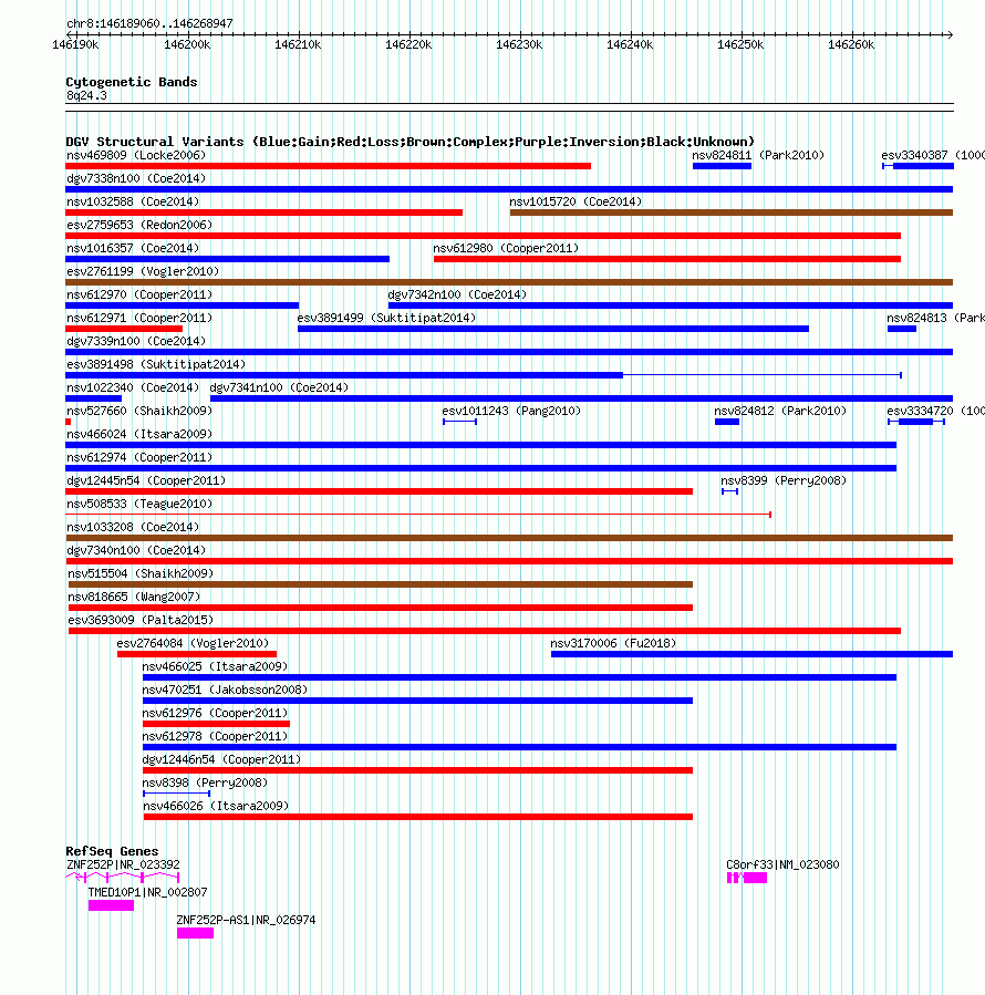 | | Variant Type | CNV loss | | Copy Number | | | Allele State | | | Allele Origin | | | Probe Count | | | Validation Flag | | | Merged Status | M | | Merged Variants | | | Supporting Variants | nsv1021946, nsv1022399 | | Samples | | | Known Genes | C8orf33, TMED10P1, ZNF252P, ZNF252P-AS1 | | Method | SNP array | | Analysis | Affymetrix SNP array copy number analysis | | Platform | Affymetrix SNP Array 6.0 | | Comments | | | Reference | Coe_et_al_2014 | | Pubmed ID | 25217958 | | Accession Number(s) | dgv7340n100
