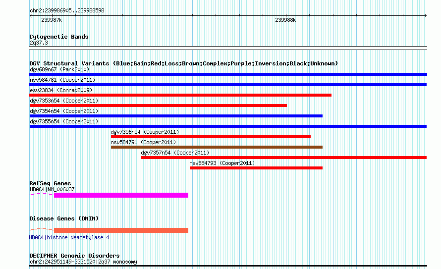 | | Variant Type | CNV gain | | Copy Number | | | Allele State | | | Allele Origin | | | Probe Count | | | Validation Flag | | | Merged Status | M | | Merged Variants | | | Supporting Variants | nsv584787, nsv584788 | | Samples | | | Known Genes | HDAC4 | | Method | SNP array | | Analysis | Illumina SNP array copy number analysis | | Platform | Not reported | | Comments | | | Reference | Cooper_et_al_2011 | | Pubmed ID | 21841781 | | Accession Number(s) | dgv7355n54