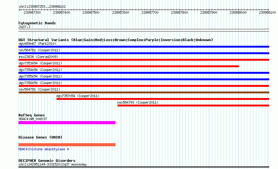 | | Variant Type | CNV loss | | Copy Number | | | Allele State | | | Allele Origin | | | Probe Count | | | Validation Flag | | | Merged Status | M | | Merged Variants | | | Supporting Variants | nsv584790, nsv584789 | | Samples | | | Known Genes | HDAC4 | | Method | SNP array | | Analysis | Illumina SNP array copy number analysis | | Platform | Not reported | | Comments | | | Reference | Cooper_et_al_2011 | | Pubmed ID | 21841781 | | Accession Number(s) | dgv7356n54