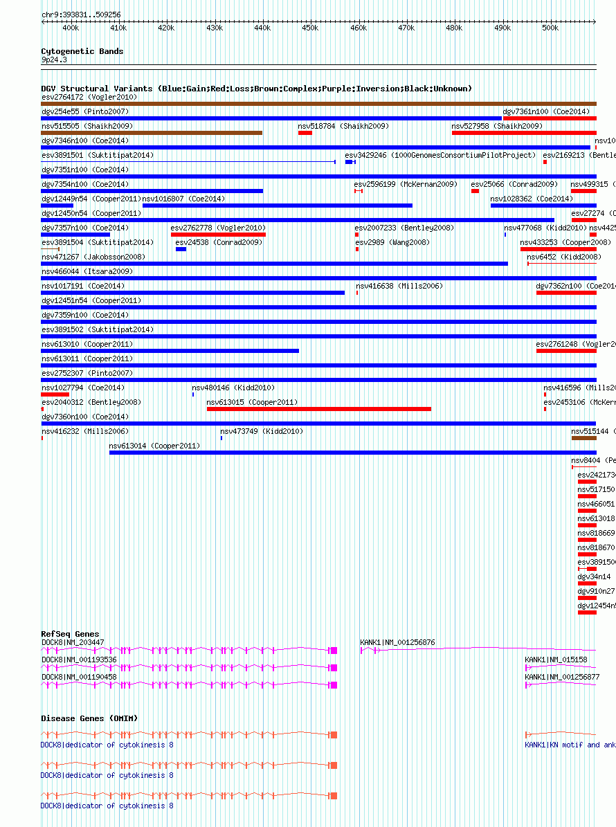 | | Variant Type | CNV gain | | Copy Number | | | Allele State | | | Allele Origin | | | Probe Count | | | Validation Flag | | | Merged Status | M | | Merged Variants | | | Supporting Variants | nsv1018307, nsv1028780, nsv1019930 | | Samples | | | Known Genes | DOCK8, KANK1 | | Method | SNP array | | Analysis | Affymetrix SNP array copy number analysis | | Platform | Affymetrix SNP Array 6.0 | | Comments | | | Reference | Coe_et_al_2014 | | Pubmed ID | 25217958 | | Accession Number(s) | dgv7360n100