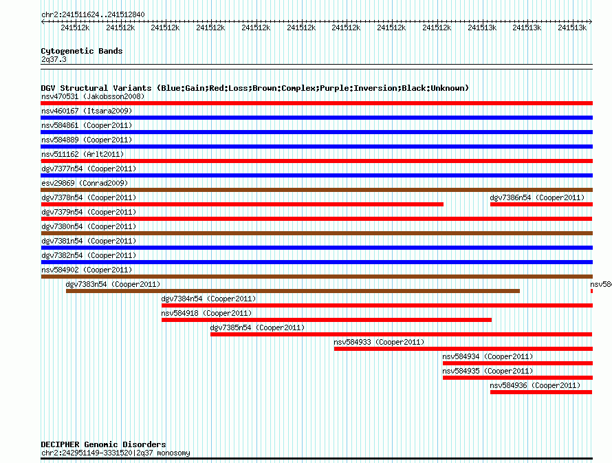 Variant DetailsVariant: dgv7379n54| Internal ID | 22775274 | | Landmark | | | Location Information | | | Cytoband | 2q37.3 | | Allele length | | Assembly | Allele length | | hg38 | 1217 | | hg19 | 1217 | | hg18 | 1217 |