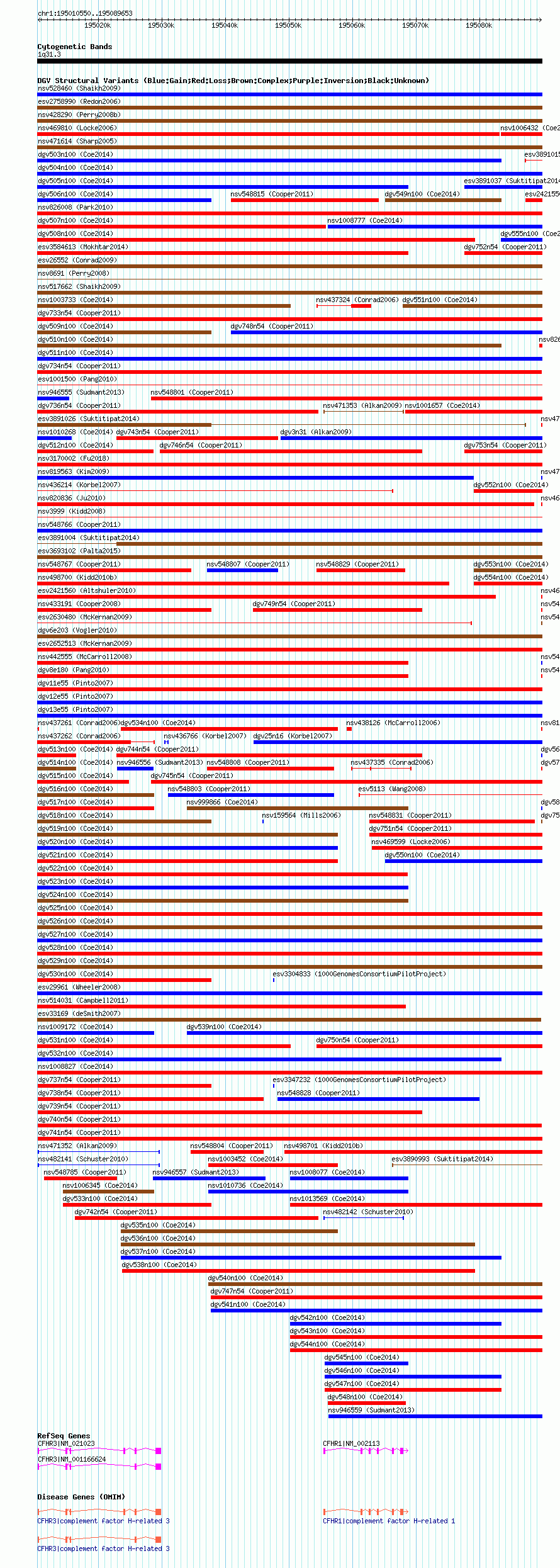 Variant DetailsVariant: dgv740n54| Internal ID | 22768635 | | Landmark | | | Location Information | | | Cytoband | 1q31.3 | | Allele length | | Assembly | Allele length | | hg38 | 79104 | | hg19 | 79104 | | hg18 | 79104 |