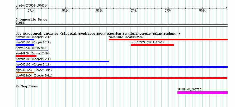 | | Variant Type | CNV loss | | Copy Number | | | Allele State | | | Allele Origin | | | Probe Count | | | Validation Flag | | | Merged Status | M | | Merged Variants | | | Supporting Variants | nsv585187, nsv585190 | | Samples | | | Known Genes | SRXN1 | | Method | SNP array | | Analysis | Illumina SNP array copy number analysis | | Platform | Not reported | | Comments | | | Reference | Cooper_et_al_2011 | | Pubmed ID | 21841781 | | Accession Number(s) | dgv7424n54