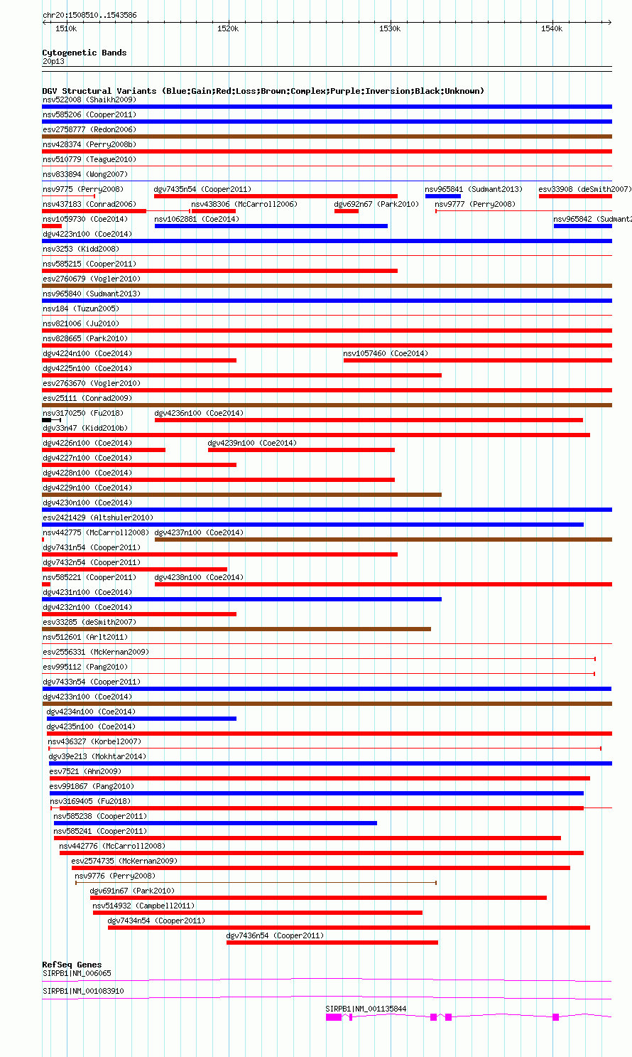 Variant DetailsVariant: dgv7433n54| Internal ID | 22775328 | | Landmark | | | Location Information | | | Cytoband | 20p13 | | Allele length | | Assembly | Allele length | | hg38 | 35077 | | hg19 | 35077 | | hg18 | 35077 |
