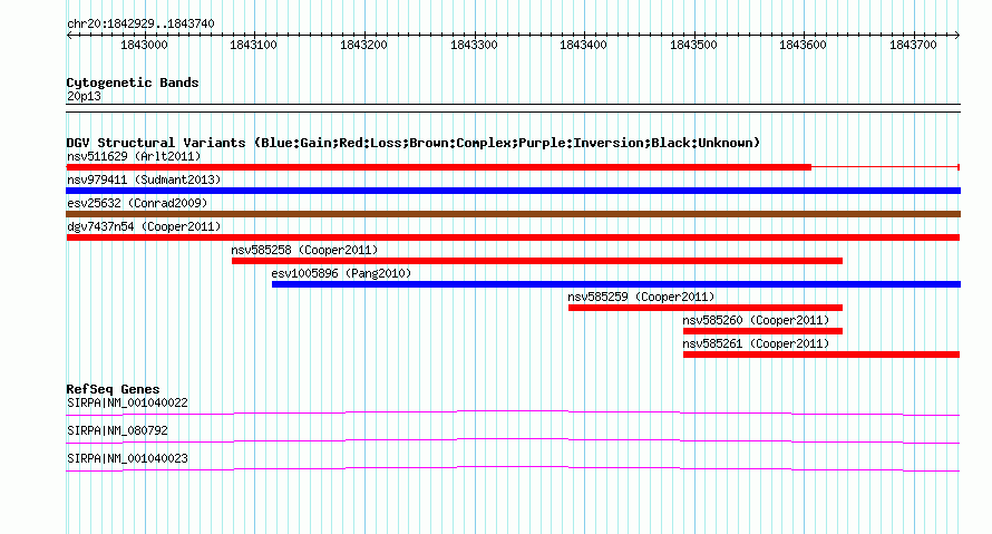 | | Variant Type | CNV loss | | Copy Number | | | Allele State | | | Allele Origin | | | Probe Count | | | Validation Flag | | | Merged Status | M | | Merged Variants | | | Supporting Variants | nsv585256, nsv585257 | | Samples | | | Known Genes | SIRPA | | Method | SNP array | | Analysis | Illumina SNP array copy number analysis | | Platform | Not reported | | Comments | | | Reference | Cooper_et_al_2011 | | Pubmed ID | 21841781 | | Accession Number(s) | dgv7437n54
