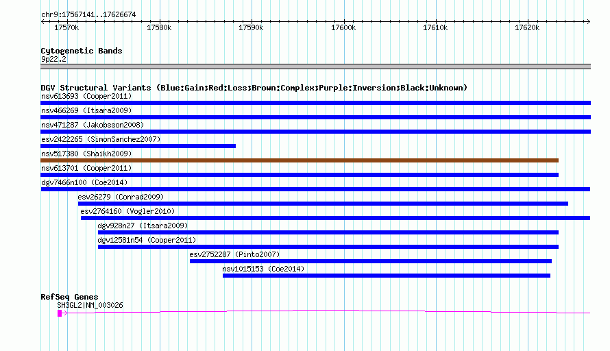 Variant DetailsVariant: dgv7466n100| Internal ID | 22793553 | | Landmark | | | Location Information | | | Cytoband | 9p22.2 | | Allele length | | Assembly | Allele length | | hg38 | 59534 | | hg19 | 59534 | | hg18 | 59534 |