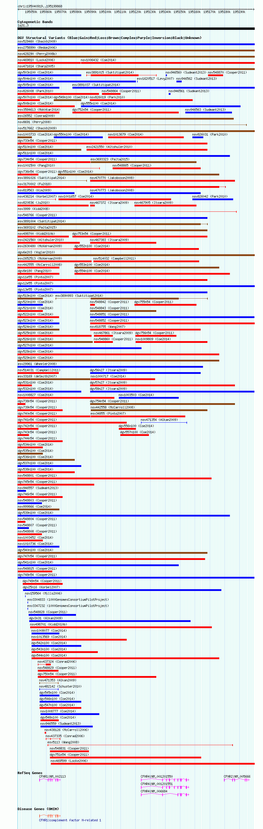 | | Variant Type | CNV gain | | Copy Number | | | Allele State | | | Allele Origin | | | Probe Count | | | Validation Flag | | | Merged Status | M | | Merged Variants | | | Supporting Variants | nsv548826, nsv548816 | | Samples | | | Known Genes | CFHR1, CFHR2, CFHR4 | | Method | SNP array | | Analysis | Illumina SNP array copy number analysis | | Platform | Not reported | | Comments | | | Reference | Cooper_et_al_2011 | | Pubmed ID | 21841781 | | Accession Number(s) | dgv748n54
