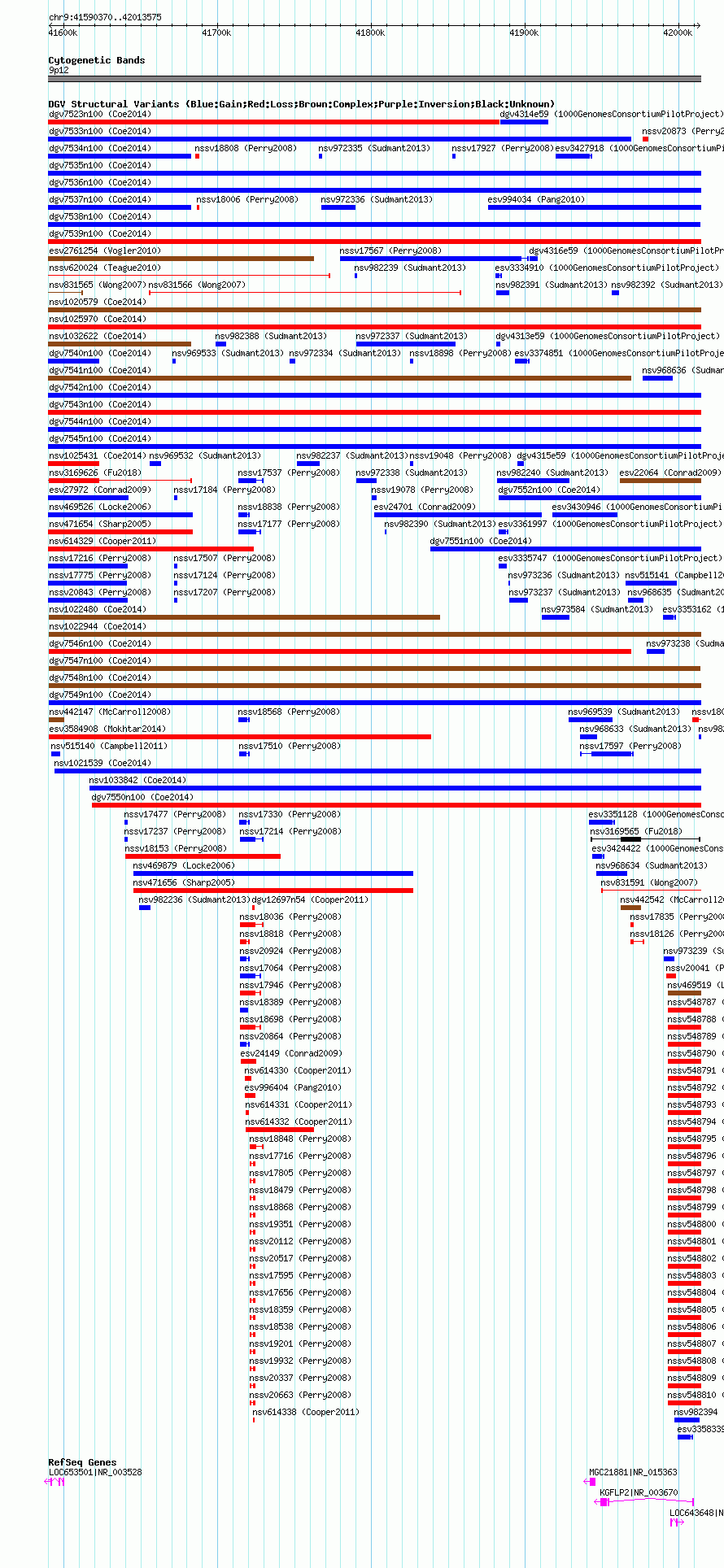 | | Variant Type | CNV gain+loss | | Copy Number | | | Allele State | | | Allele Origin | | | Probe Count | | | Validation Flag | | | Merged Status | M | | Merged Variants | | | Supporting Variants | nsv1022230, nsv1017869 | | Samples | | | Known Genes | KGFLP2, LOC643648, LOC653501, MGC21881 | | Method | SNP array | | Analysis | Affymetrix SNP array copy number analysis | | Platform | Affymetrix SNP Array 6.0 | | Comments | | | Reference | Coe_et_al_2014 | | Pubmed ID | 25217958 | | Accession Number(s) | dgv7547n100